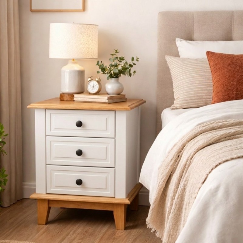 Possui 3 gavetas em Laca que correm na madeira com puxadores metálicos e é excelente para ajudar na organização de seu quarto. Seu design é moderno e combina com qualquer móvel que fabricamos. Super resistente com estrutura em MDF e o acabamento em Laca Branca e Gavetas em Laca Branca, resistente ao desgaste natural, preserva a cor e hoje é considerado uma das melhores pinturas para móvel de madeira. Seu tampo e seus pés são de madeira taeda, super forte e resistente, dando mais durabilidade ao móvel.