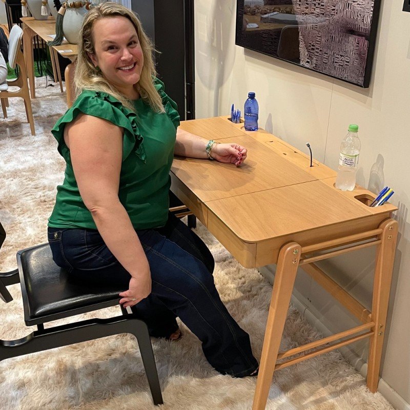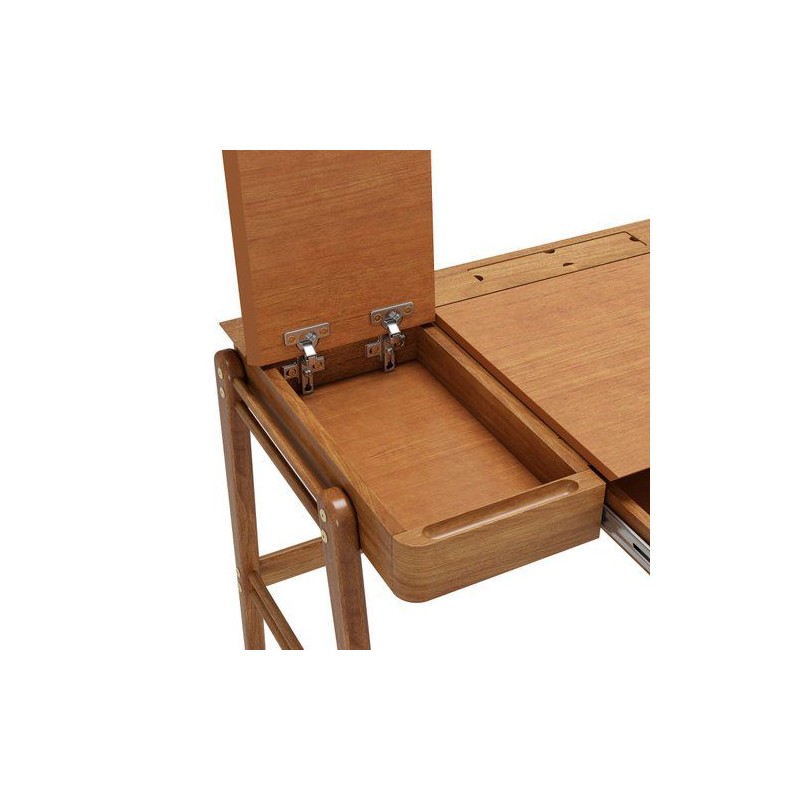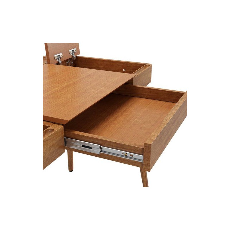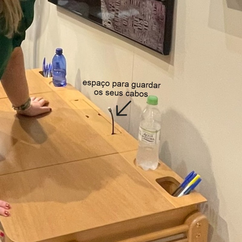 A escrivaninha é de madeira sofisticada, com alta qualidade e bem resistente. Possui porta cabos, porta canetas, porta copos. E os seus tampos levantam em suas laterais para que você consiga guardar os seus pertences dentro da mesa. E ainda tem a gaveta central com corrediças telescópicas para guardar mais itens. É uma peça muito moderna e muito funcional.
