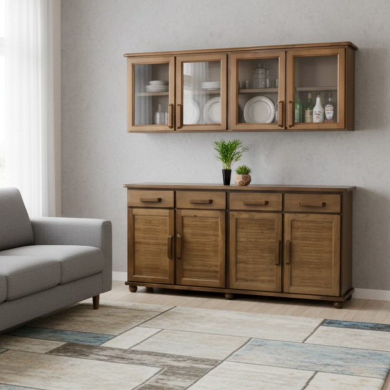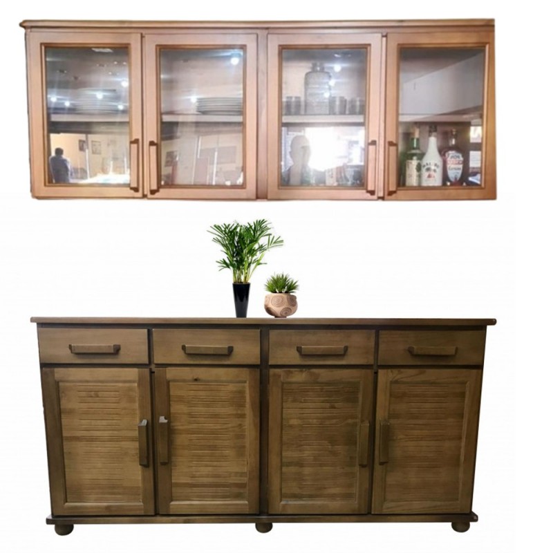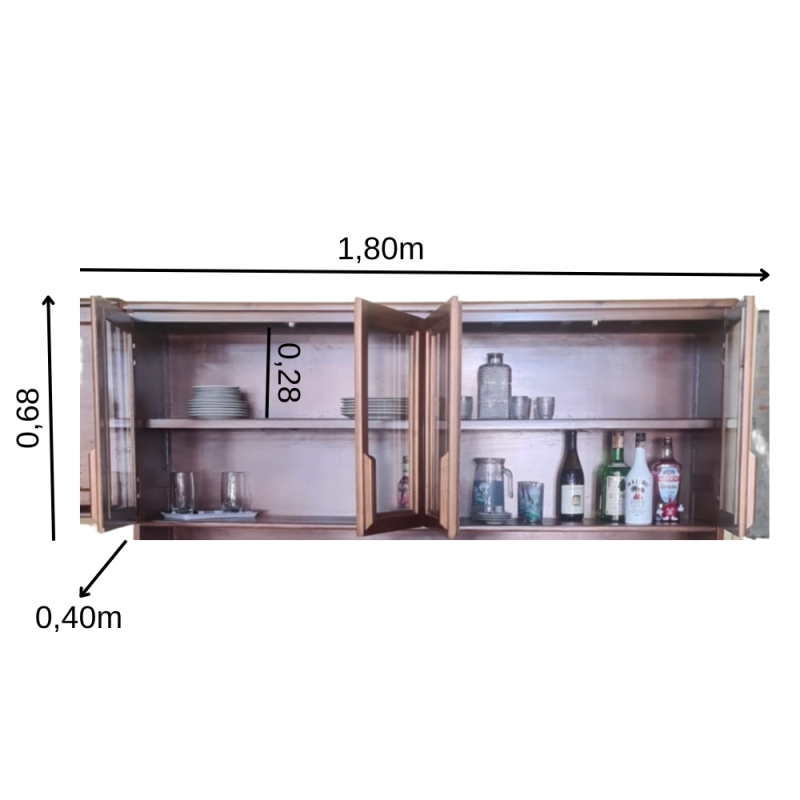 - Portas: 04 portas de abrir de madeira embaixo e 4 portas de abrir de vidro em cima.
