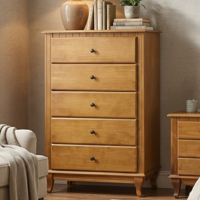 A Cômoda Estrela possui 5 gavetas com corrediças metálicas de alta qualidade, com puxadores metálicos, trazendo elegância e requinte para o seu quarto, além de espaço para a organização de seu ambiente. Seu grande diferencial está na fundura das gavetas, e é uma das cômodas com gavetas mais fundas da loja e o que agrada a todos por colocarem roupas mais volumosas. Seu design é clássico e combina com qualquer armário de madeira que fabricamos. Super resistente com estrutura toda em madeira Taeda de alta qualidade com acabamento em verniz, deixando o móvel sedoso e livre de arranhões. Sendo assim, a cômoda traz maior durabilidade dando um toque diferenciado ao seu ambiente.
