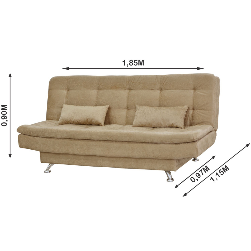Móvel com duas utilidades: Sofá de três lugares quando fechado e cama quando aberto. Possui 2 almofadas que podem ser usadas como travesseiros.