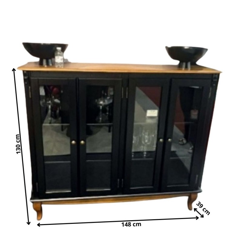 Cristaleira de Madeira com 4 Portas em Design Country e Acabamento em Laca Preta e Madeira Natural