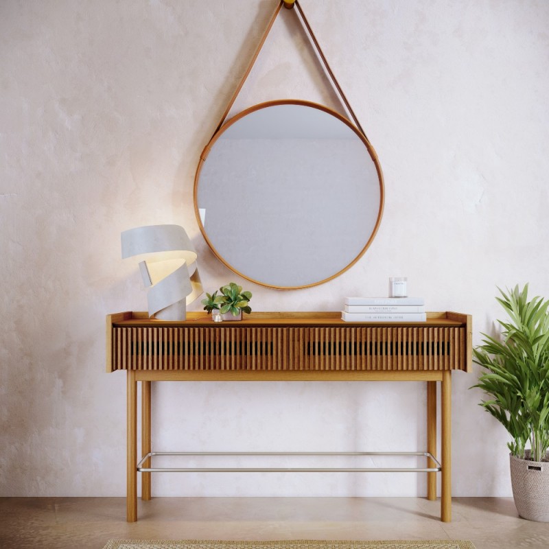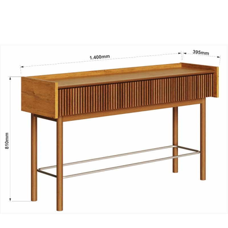 O Aparador Duna 1,40m traz charme ripado, 2 gavetas com corrediças telescópicas e um elegante detalhe metálico inferior que valoriza a decoração. Na tonalidade mel, ele organiza com estilo e adiciona um toque moderno ao ambiente