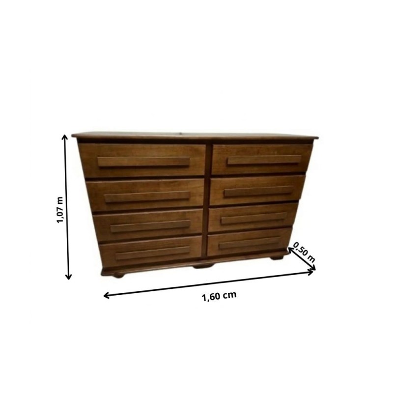 A Cômoda Malu possui 4 gavetas grandes de um lado e mais 4 gavetas grandes do outro lado com corrediças que correm na madeira de alta qualidade, com puxadores retos sicilianos de madeira, trazendo elegância e requinte para o seu quarto, além de espaço para a organização de seu ambiente. Seu design é clássico e combina com qualquer armário de madeira que fabricamos. Super resistente com estrutura toda em madeira pinus reflorestável de alta qualidade com acabamento em verniz fosco, deixando o móvel sedoso e livre de arranhões. Sendo assim, a cômoda traz maior durabilidade dando um toque diferenciado ao seu ambiente.
