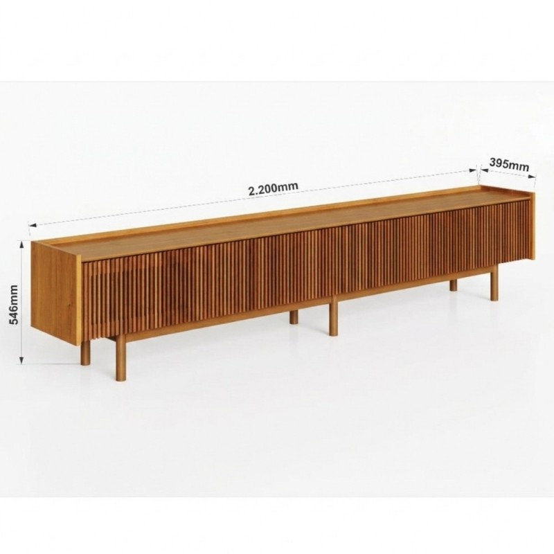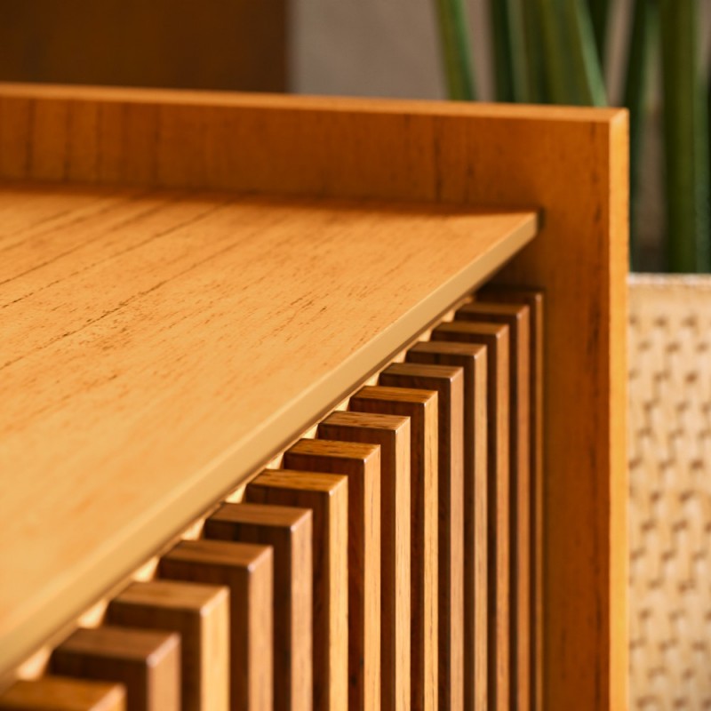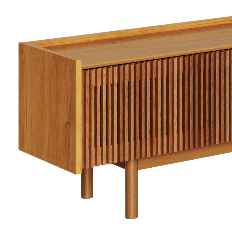 O charme do ripado conquista à primeira vista. O Rack Duna 2,20m une beleza e funcionalidade, com gavetas espaçosas de corrediças telescópicas ideais para guardar controles, revistas e objetos do dia a dia com praticidade e estilo.