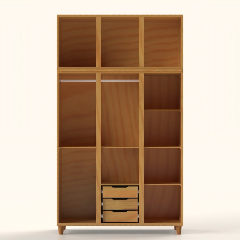 Possui maleiro duplex, podendo guardar roupas de cama e banho e roupas volumosas como casacos de frio. No interior da peça, é possível aproveitar ao máximo todas as divisórias, posicionando as roupas de maneira que tornem-se acessíveis. Além disso, pela grande quantidade de divisões, as roupas podem ser acomodadas sem amassar ou danificar o tecido, ideal tanto para peças mais comuns quanto para itens delicados. O armário possui puxadores de madeira, suas gavetas possuem corrediças telescópicas com trav de segurança e seu cabideiro é metálico. As prateleiras e as divisórias são em MDF com pintura UV.