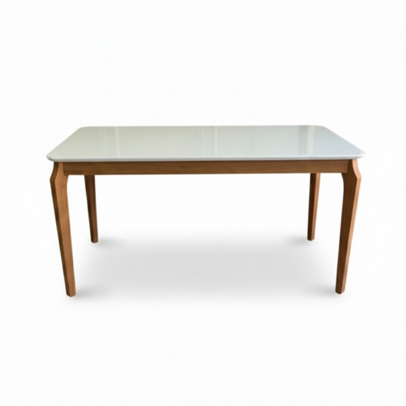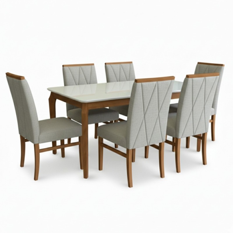 Conjunto com mesa de madeira com vidro off white 1,60m e 6 cadeiras Anatômicas em linho bege, que trazem conforto e fácil limpeza no dia a dia. Ideal para reunir a família ou receber amigos com estilo e praticidade. O tampo retangular acomoda bem até 6 pessoas. Um toque moderno e acolhedor para sua sala de jantar.