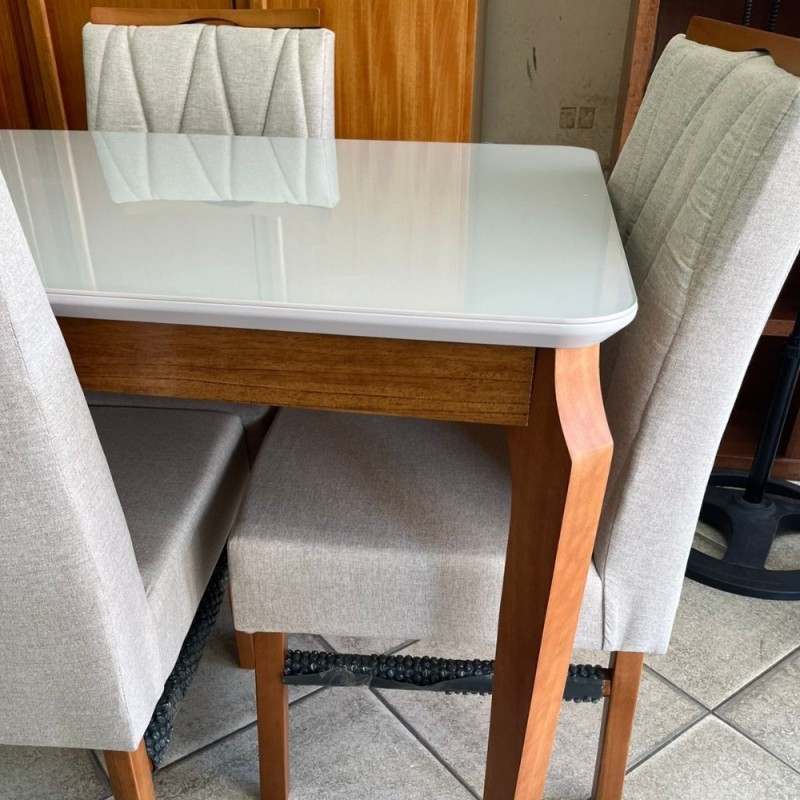 Super resistente com sua base em estrutura em madeira eucalipto de alta qualidade. Seu tampo é com vidro off white. Suas Cadeiras são Anatômicas e possuem a estrutura em madeira eucalipto e tecido em linho bege trazendo mais luxo e sofisticação, além de facilitar a limpeza no seu dia a dia. Possui acabamento em verniz fosco, deixando o móvel sedoso e livre de arranhões. Sendo assim, o Conjunto de Mesa traz maior durabilidade dando um toque diferenciado ao seu ambiente.