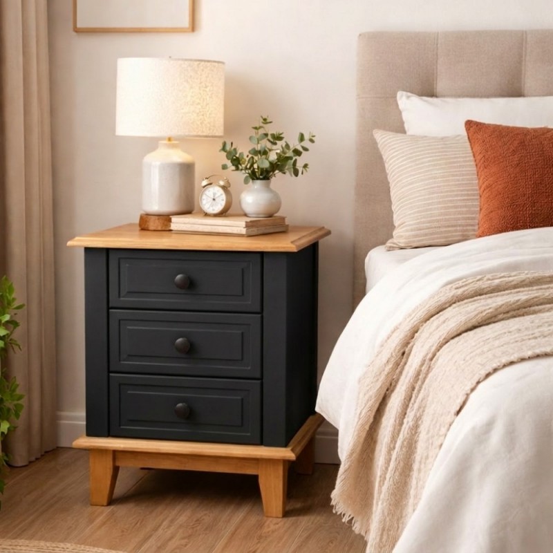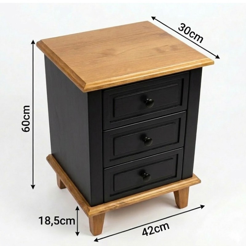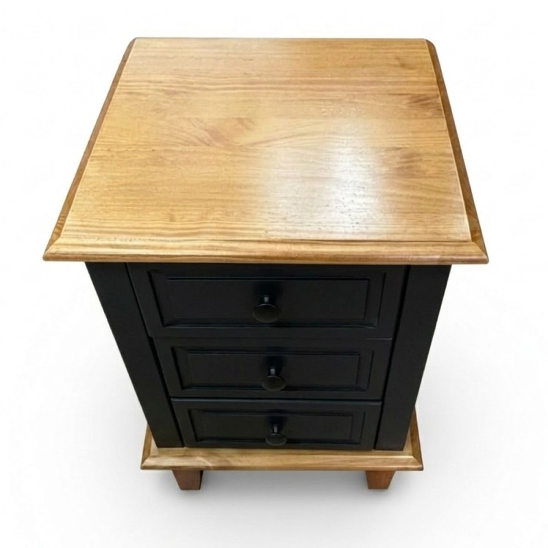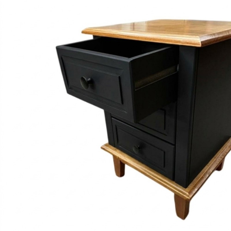 Possui 3 gavetas em Laca que correm na madeira com puxadores metálicos e é excelente para ajudar na organização de seu quarto. Seu design é moderno e combina com qualquer móvel que fabricamos. Super resistente com estrutura em MDF e o acabamento em Laca Preto e Gavetas em Laca Branca, resistente ao desgaste natural, preserva a cor e hoje é considerado uma das melhores pinturas para móvel de madeira. Seu tampo e seus pés são de madeira taeda, super forte e resistente, dando mais durabilidade ao móvel.
